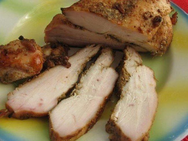 Выкладываем грудку на противень, застеленный фольгой и на 12 минут в духовку при той же температуре (если грудка больше, то 15 мин — не больше). Не передержите, иначе мясо получится сухое.