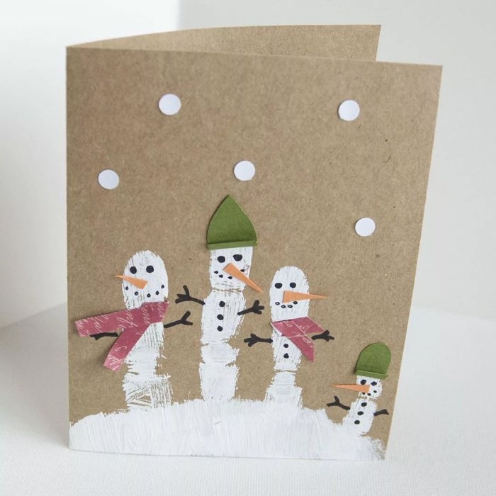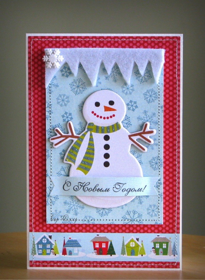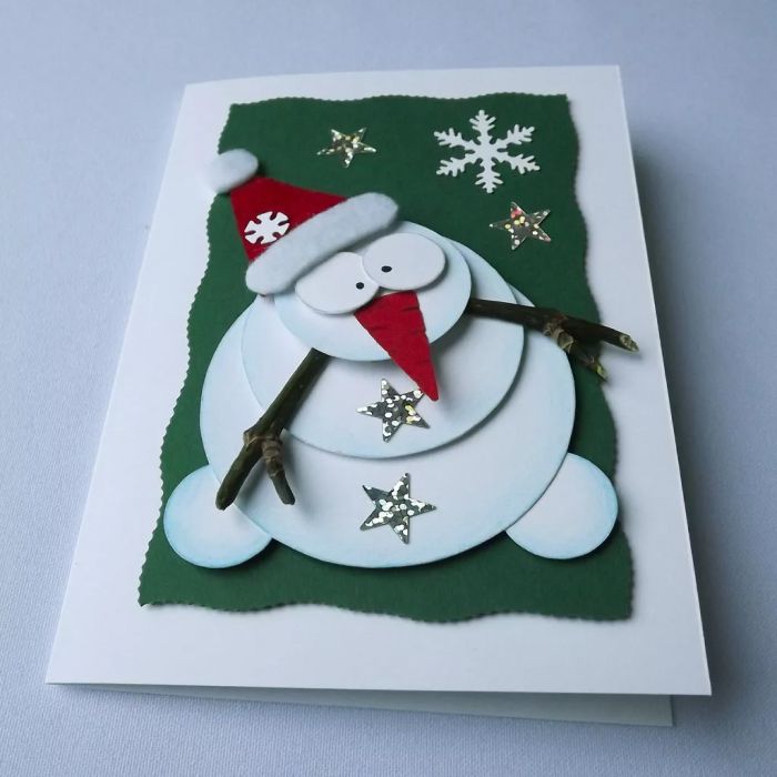 После того, как открытка высохнет, напишите искреннее пожелание. Все, ваша открытка готова! - Для дополнительного декора открытки вы можете использовать вату, кусочки шелка и обоев и даже такую крупу как рис, манка и пшеница. Вы можете нарисовать снеговика на открытке, но еще лучше сделать его из ваты и ткани. Начав делать одну новогоднюю открытку своими руками, вы увидите, как у вас сразу же возникнут десятки идей для других.