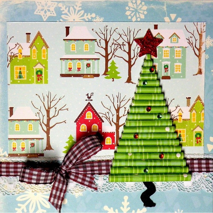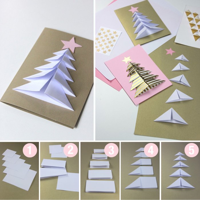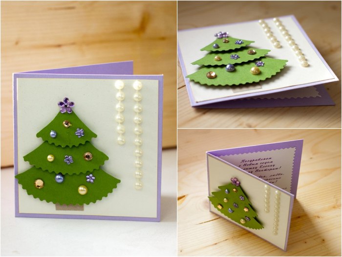 - Из зеленого картона вырезаем маленькую елочку и размещаем ее в уголке открытки. Из картона другого цвета можно вырезать подарочные коробки, елочные шарики, бантики или звезды. Все элементы красиво размещаем и приклеиваем.