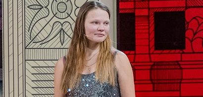 Образ получился смелый, дерзкий, но… неудачный. В этом длинном широкоплечем блейзере и платье свободного кроя Мария смотрится на пару размеров больше. Нужно было обязательно обозначить талию. Добавить пояс на платье, например, или выбрать фасон по фигуре. Тогда силуэт не казался бы бесформенным.