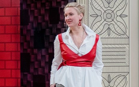 Золотистое платье-жакет в стиле ретро очень идет Анне. На мой взгляд, это единственный наряд из всех представленных, который соответствует пожеланиям мужа Бориса. В таком платье не стыдно показаться перед утонченными работниками театра или посетить торжественное мероприятие. Блестящая ткань смотрится дорого, а рукава-буфы, пышная юбка и акцент на талии создают правильные пропорции силуэта.