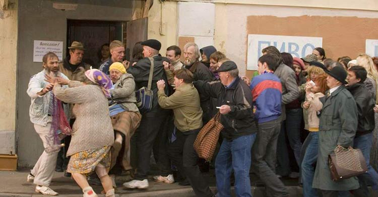 Перед покупкой чего либо, для имитации очереди, просто постойте перед магазином от 20 до 2000 минут. Если есть возможность, то можно найти и чинить жигули -“копейку”.