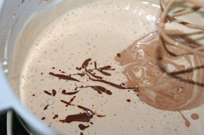 6. Коричневый крем нужно вылить на охлажденный белый крем, чтобы слои не смешивались.