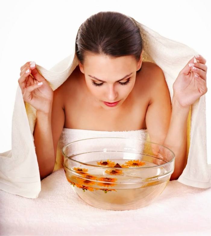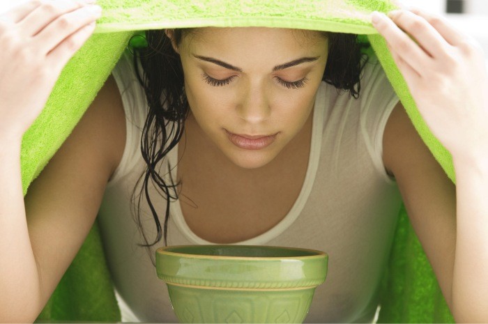 - Умойте лицо, соберите волосы в пучок, чтобы они не мешались, наклоните голову над кастрюлей, а сверху укройтесь полотенцем.