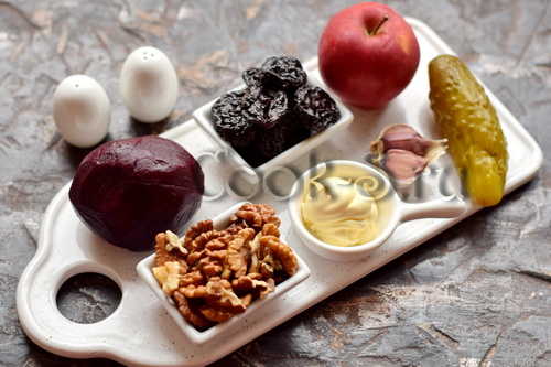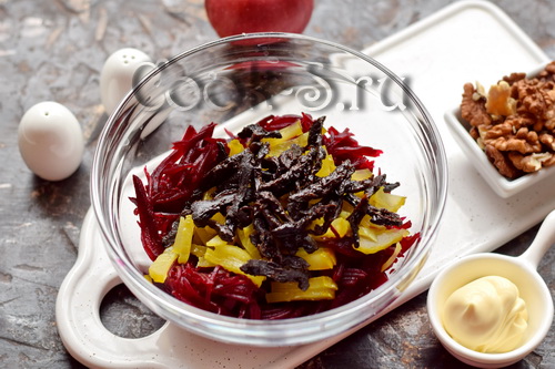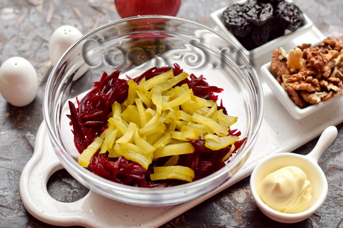 Добавляем соломку чернослива. Если сухофрукты твердые, нужно размочить в кипятке.