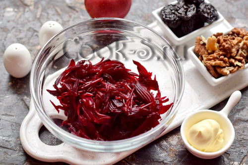 Яблоко очищаем от кожуры и семян, трем на терке и также отправляем в салатник.