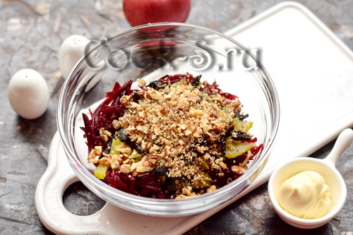 Грецкие орехи рубим ножом в крошку и добавляем в салат.