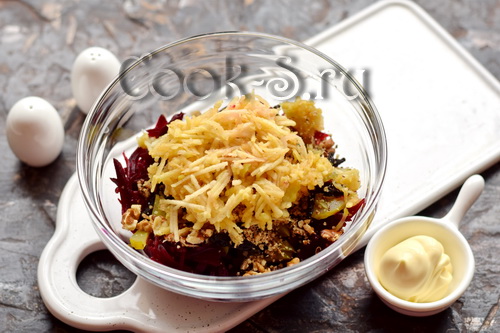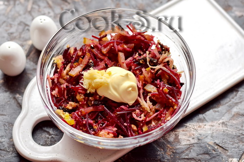 Все ингредиенты хорошо перемешиваем, заправляем майонезом и пропускаем чеснок через пресс. Солим по вкусу.