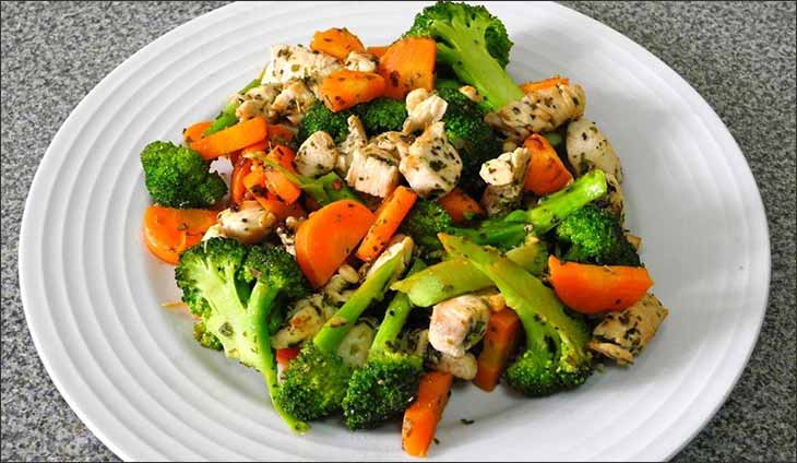 Отварите 120 грамм куриного филе, но учтите, что при варке вес филе уменьшится на 25-30%. Поэтому положите в кастрюлю 150-160 грамм куриного мяса. Возьмите морковку и 200 грамм брокколи, порежьте и тушите в течение 10 минут. Порежьте филе на мелкие кусочки и добавьте к овощам. Продолжайте тушить до готовности. Готовый салат можно сбрызнуть лимоном и заправить оливковым маслом. Приятного аппетита!