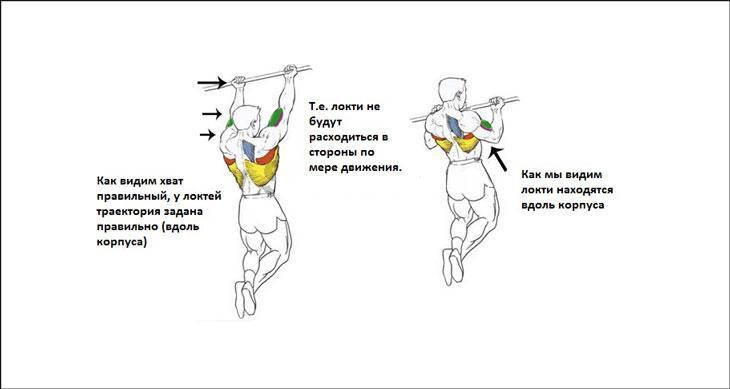 Чем шире вы возьметесь за перекладину, тем меньше нагрузится брахиалис, а внешняя головка бицепса начнет делиться нагрузкой с внутренней головкой. Таким образом, двуглавая мышца плеча прорабатывается равномерно. Широчайшие начинают работать с акцентом на внешнюю часть.