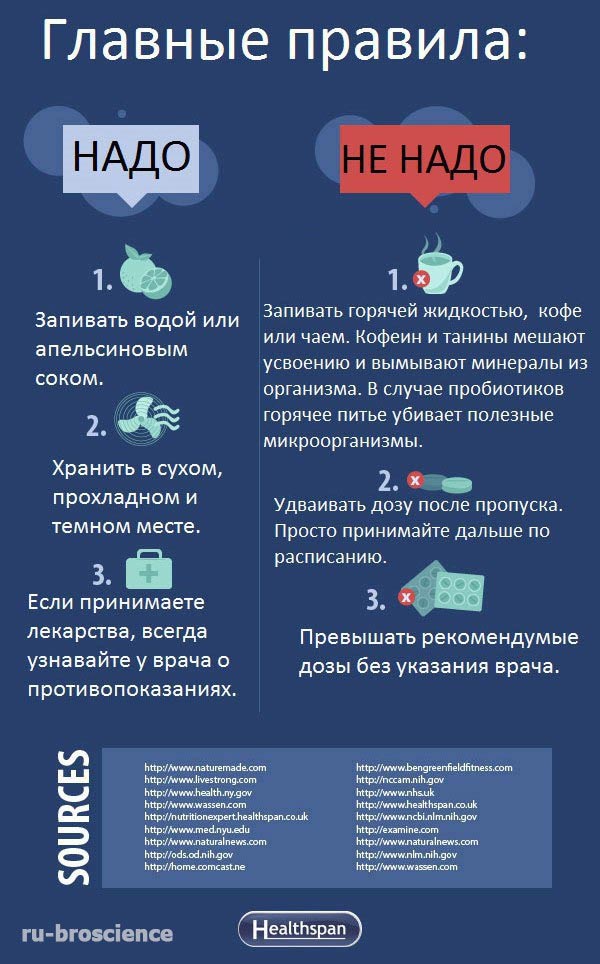 Это руководство основано на результатах множества исследований и разъясняет, каких сочетаний надо избегать, что лучше принимать с пищей, а что — натощак. Помните, что правильное время приема и сочетание добавок приносит НАМНОГО БОЛЬШЕ пользы для организма. Так что сохраните у себя и запомните эти простые правила