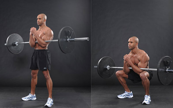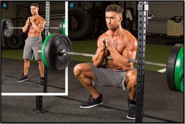 - Удерживая штангу в руках, сядьте немного ниже параллели, пока гриф легонько не коснется коленного сустава.