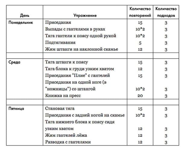 Как составить правильные занятия для женщин в зале, вам подскажет таблица, представленная ниже.