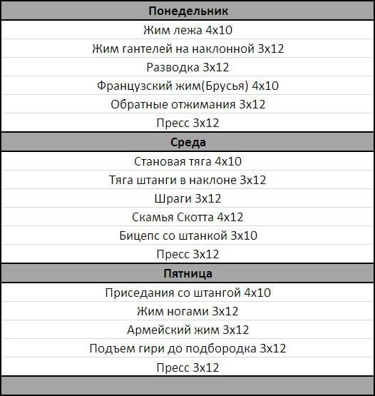 Базовая тренировка в зале для мужчин может выглядеть следующим образом.