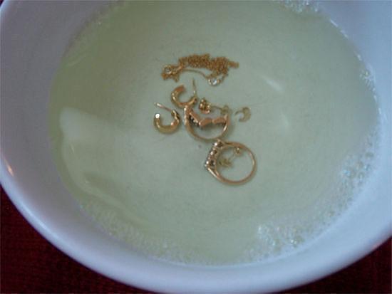 Отправляем в эту воду ювелирные изделия. Через 10 минут достаем, промываем под проточной водой и протираем насухо мягким полотном.