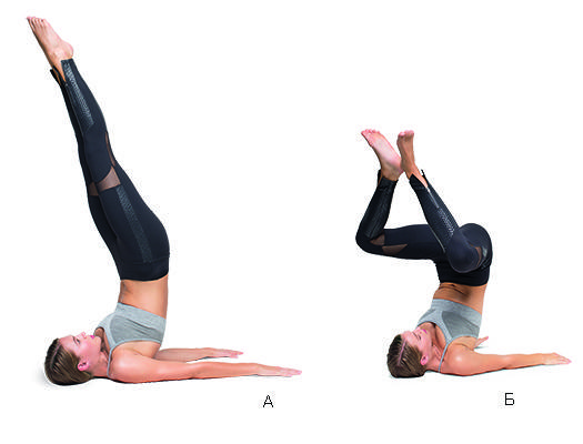 Лягте на спину, вытяните и сомкните ноги, руки — вдоль тела (ладони направлены в пол). На выдохе поднимите ноги и бедра, перекатившись на лопатки (но не на шею!), направив мыски в потолок (мыски — на уровне глаз) (А). На вдохе согните ноги в коленях и разведите их в стороны, направив колени к плечам и соединив пятки (Б). На выдохе вернитесь в исходное положение. Сделайте 10 повторений.