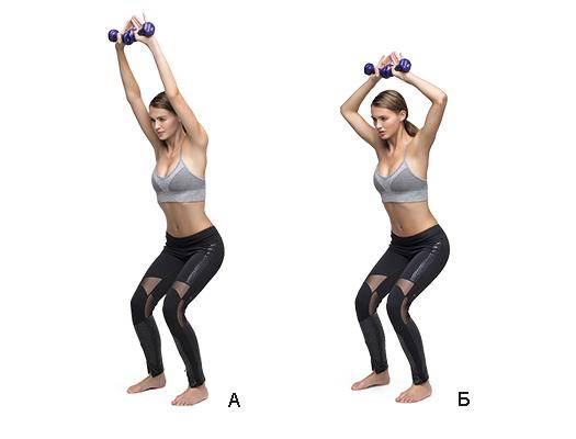 Встаньте прямо, ноги — на ширине плеч. Возьмите в руки гантели и опустите их вдоль тела. Опуститесь в полуприсед, отведя таз назад. Слегка наклонитесь вперед, сохраняя позвоночник прямым. На вдохе выпрямите руки над головой (бицепсы прижаты к ушам, большие пальцы соприкасаются, а ладони направлены вперед) (А). На выдохе согните руки, направив локти в стороны, и притяните гантели к голове (Б). Вернитесь в исходное положение. Повторите 10 раз.