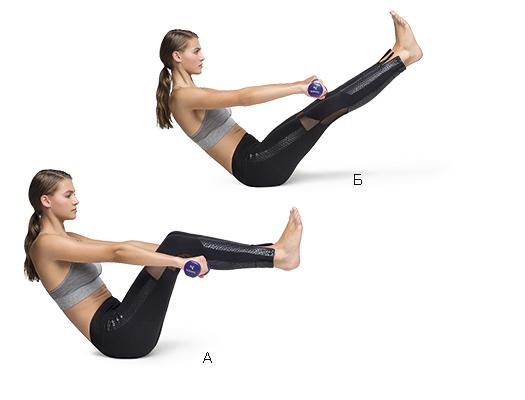Сядьте на коврик, возьмите в руки гантели и опустите их вдоль тела. Согните ноги в коленях и приподнимите над полом. Выпрямите руки вперед, удерживая их на высоте груди (ладони направлены в пол) (А). На вдохе отклоните корпус назад и выпрямите ноги под углом 45 градусов, мыски натяните на себя (Б). На выдохе вернитесь в исходное положение. Сделайте 10 повторений.