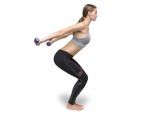 Встаньте прямо, ноги — вместе, возьмите в руки гантели и опустите их вдоль тела. Опуститесь в полуприсед. Выпрямите руки позади себя (ладони направлены в потолок). На вдохе поднимите руки вверх примерно на 15–20 см (как показано на фото). На выходе вернитесь в исходное положение. Сделайте 10 повторений.
