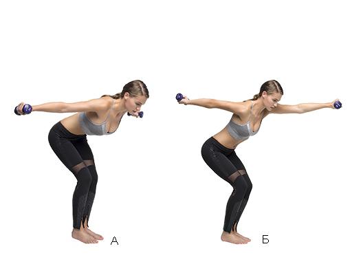 Встаньте прямо, ноги — вместе, возьмите в руки гантели и опустите их вдоль тела. Согните ноги в коленях и наклонитесь вперед до тех пор, пока ваш корпус не будет параллелен полу. Опустите руки вниз (ладони направлены друг к другу). На выдохе поднимите руки на высоту плеч (ладони направлены в пол) (А). На вдохе вернитесь в предыдущую позицию. Сделайте 10 повторений. Затем на выдохе вытяните левую руку вперед (ладонь направлена в пол), а правую руку — назад (ладонь направлена в потолок) (Б). На вдохе вернитесь в исходное положение. Смените сторону и сделайте еще 10 повторений.