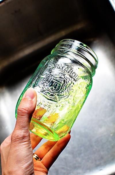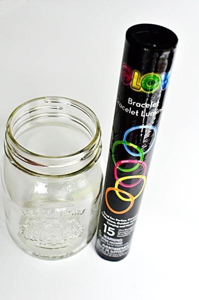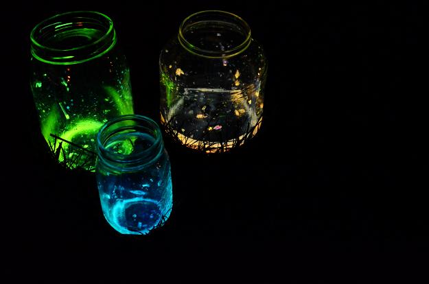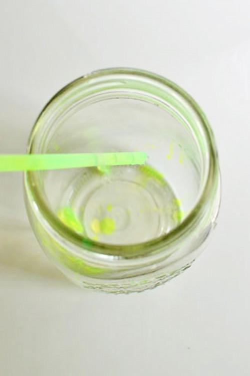 Обязательно одеваем резиновые перчатки, берем две светящиеся палочки, подносим к банке и обрезаем кончики. Все содержимое выливаем в банку. Можно использовать несколько цветов, после смешивания которых получится оригинальный эффект.
