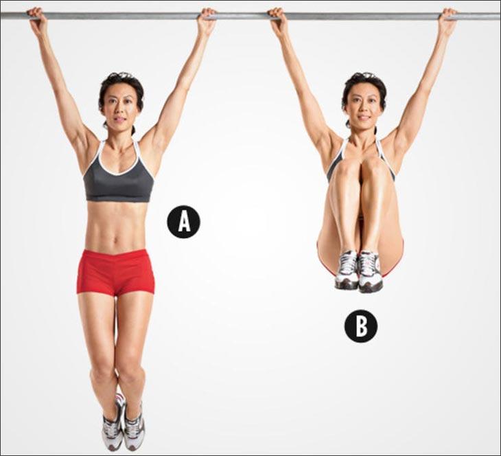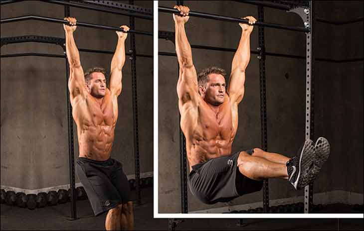 - Подъемы согнутых ног в висе на перекладине – выполните 3-4 сета по 12-20 подъемов.