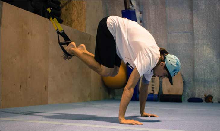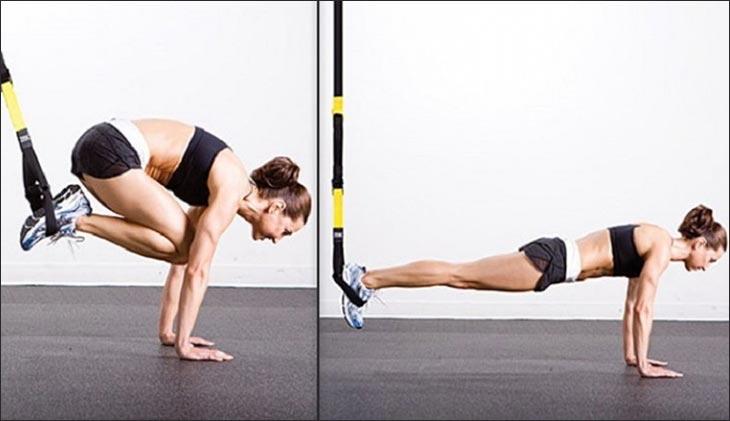 - Поочередная тяга коленей к поясу по одному или сразу оба (используйте TRX петли) – выполните 3-4 сета по 12-20 повторений на каждую ногу.