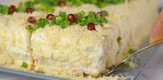 Получается очень вкусным, сытным и в меру влажным: каждый кусочек тает во рту. Сделанные из слоеного теста коржи после пропитки становятся невероятно нежными. Рыбная начинка отлично сочетается с яйцами и сливочным сыром. Морковь с чесноком добавляют закуске пикантности. В общем, хвалить можно долго, но лучше приготовить и попробовать: вам понравится результат.